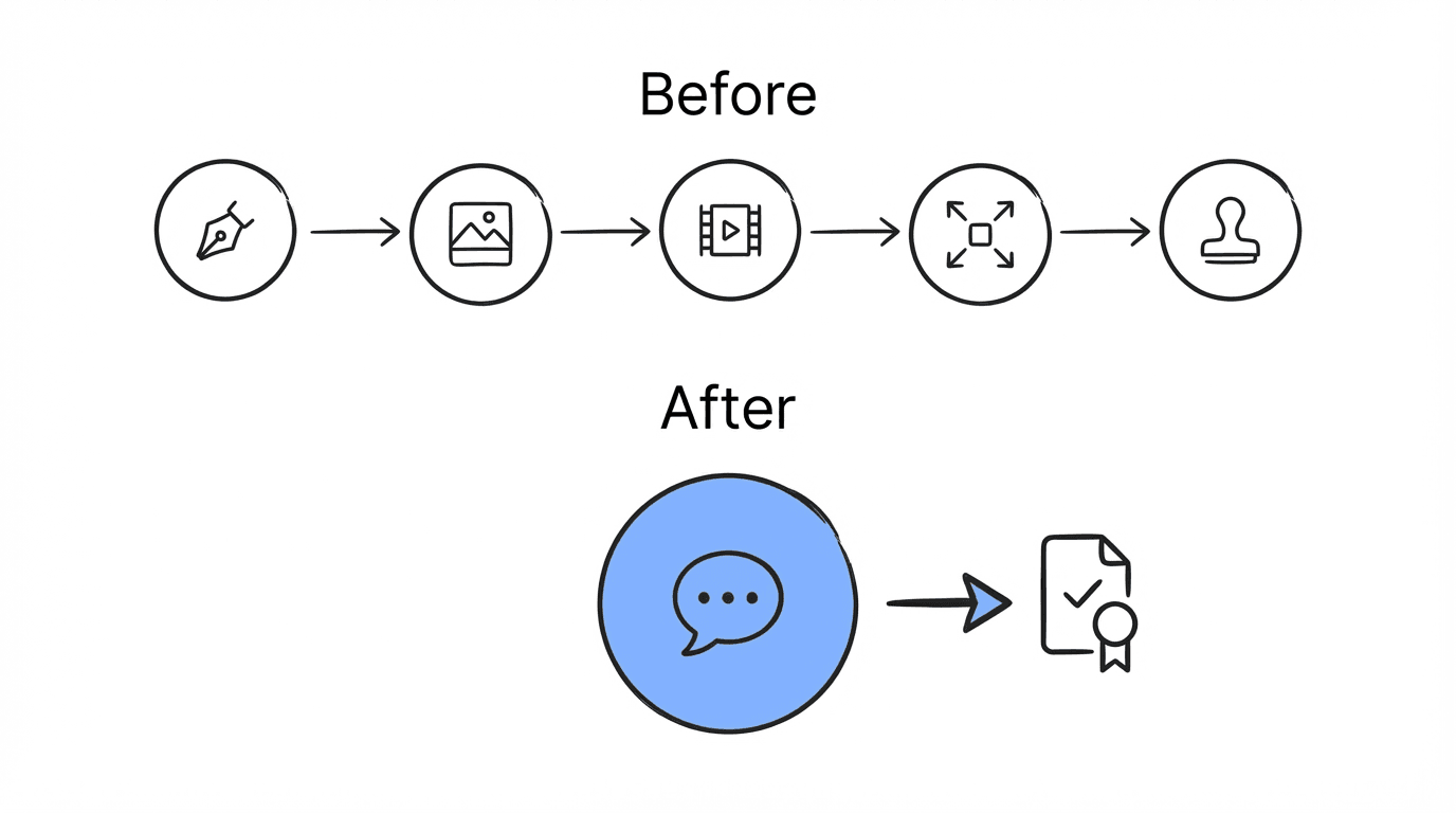 Each step requires re-uploading assets, re-entering brand information, and context-switching between interfaces. The time savings from AI in step one get consumed by the friction in steps two through five.