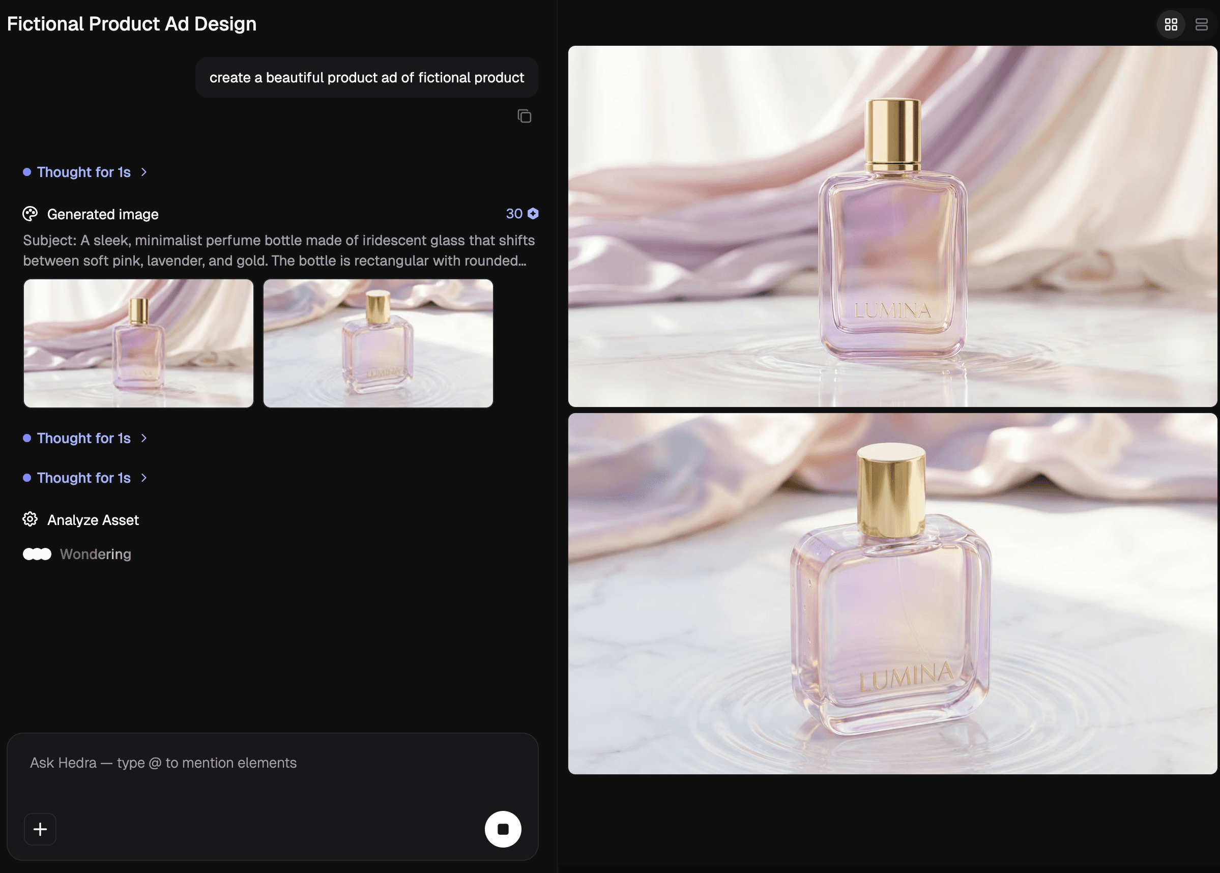 This turns the Agent into a creative partner for direction-setting, not just execution. Teams can evaluate options before committing, then move into production within the same conversation.