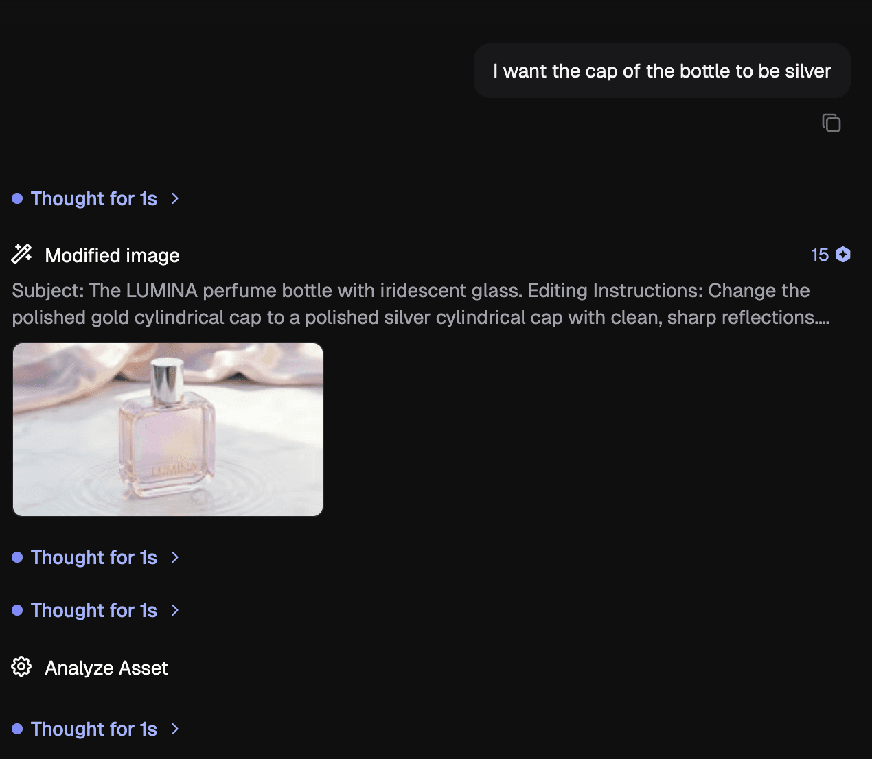 Agent adjusts lighting and composition, generates multiple angles, applies typography, and outputs platform-ready layouts. That is not one generation. That is a full workflow from a single instruction.